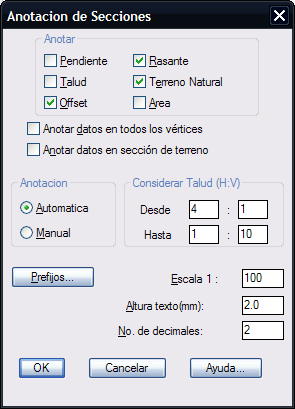 Los datos que pueden anotarse manual o automáticamente son: pendiente, talud, offset, rasante, elevación de terreno natural y área. Se puede especificar un rango de valores para considerar la pendiente como talud, indicando la relación horizontal/vertical. Los prefijos que se anteponen a los datos anotados pueden modificarse en la caja de diálogo correspondiente. Según la escala de sección indicada se calcula la conversión de la altura de texto y títulos en milímetros. La cantidad de decimales que aparecerán en los datos se indica en la casilla correspondiente.